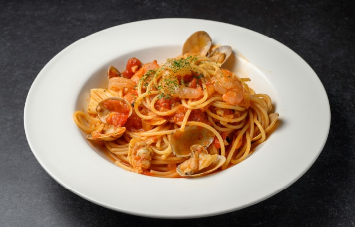 魚介類をふんだんに使用し、トマトソースで上品に仕上げたちょっと贅沢なパスタです。